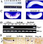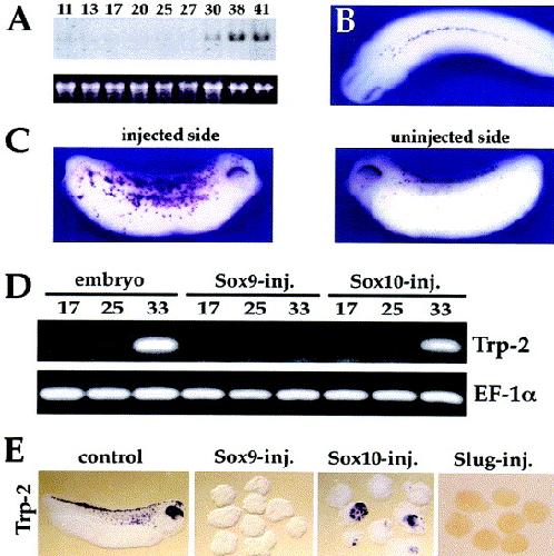 Fig. 5. Sox10 is sufficient to induce pigment cell lineage as revealed by Trp-2 expression. (A) Developmental expression of Xenopus Trp-2 by Northern hybridization. The stages are according to Nieuwkoop and Farber (1967). (B) By whole-mount in situ hybridization at stage 27/28, Trp-2 is detected in the developing retina and in individual cells scattered at the dorsal midline at a level posterior to the hindbrain. Dorsal view, anterior to the left. (C) An embryo injected at the two-cell stage with 1 ng of Sox10 mRNA and analyzed at stage 30 displays massive ectopic expression of Trp-2 (left panel), while the uninjected side is unperturbed (right panel). Lateral view, anterior is to the right. (D) RT-PCR analysis of animal explants derived from embryos injected at the two-cell stage with 1 ng of Sox9 or Sox10 mRNA. Only Sox10 overexpression induces strong expression of Trp-2 at stage 33. EF1-alpha is used as a loading control. (E) In situ hybridization of explants overexpressing Sox9, Sox10, or Slug. Induction of Trp-2 is exclusively detected in Sox10-injected animal explants at equivalent stage 32. Trp2 expression in an uninjected embryo (control) at stage 32 is shown (left panel).