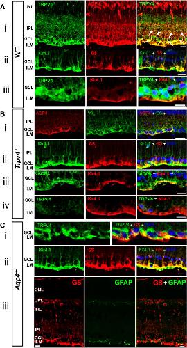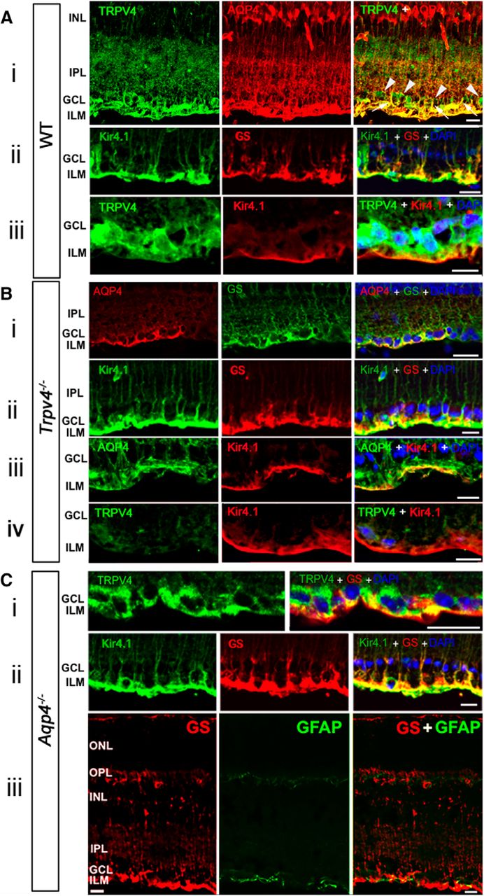 Figure 1. TRPV4 and AQP4 colocalize in the mouse inner retina, yet TRPV4 and AQP4 trafficking are independent of each other. Ai, Vertical cryosections of WT mouse retinas immunolabeled for TRPV4 (Alexa Fluor 488) and AQP4 (Alexa Fluor 594) show preferential colocalization in Müller end feet and proximal processes entering the IPL (arrows). RGC somata are TRPV4 immunopositive and do not express AQP4 (arrowheads). Aii, Aiii, Higher magnification of Müller end feet double labeled for Kir4.1 and GS, and TRPV4 and Kir4.1, respectively. Nuclei labeled with DAPI. GCL, Ganglion cell layer; INL, inner nuclear layer. Scale bars, 20 μm. Bi–Biii, Trpv4−/− retina. GS and Kir4.1 signals in KO tissue are indistinguishable from WT controls, whereas AQP4 signals appear to be less pronounced. Biv, Limited nonspecific TRPV4 immunoreactivity in Trpv4−/− retina costained for Kir4.1. C, Aqp4−/− retinas. Ci, TRPV4 and GS colocalize in glial end feet at the blood–retina barrier, whereas RGC somata are immunoreactive for TRPV4. Cii, Double labeling for GS and Kir4.1 shows normal targeting to glial processes and end feet. Ciii, GFAP is expressed in astrocyte processes but is absent from GS immunoreactivity in Müller processes and end feet, indicating absence of reactive gliosis. Scale bars, 20 μm.