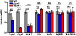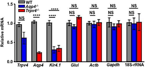 Figure 2. Expression of Trpv4, Aqp4, and Kir4.1 transcripts is effected by genetic elimination of TRPV4 or AQP4. Semiquantitative RT-PCR analysis of mRNA levels in WT, Trpv4−/−, and Aqp4−/− mouse retinas. Fold change in mRNA expression was calculated relative to basal after normalization of expression to α-tubulin (Tuba1a) mRNA. The relative abundance of Trpv4 transcripts is decreased in Aqp4−/− samples and vice versa. Kir4.1 transcript levels are lower in both Trpv4−/− and Aqp4−/− retinas, whereas the abundance of presumed housekeeping genes Glul, Actb, Gapdh, and 18S rRNA (the 18S structural subunit of the small eukaryotic 40S ribosomal subunit, 18S-rRNA) mRNAs was unaffected by the deletion of Trpv4 or Aqp4.