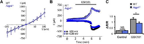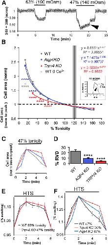 An aquaporin-4/transient receptor potential vanilloid 4 (AQP4/TRPV4) complex is essential for cell-volume control in astrocytes.