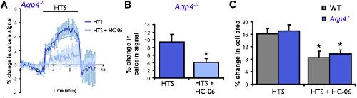 TRPV4 blockers suppress the swelling of Aqp4â/â Müller glia loaded with calcein AM. A, The TRPV4 antagonist HC-06 (1 μm) suppresses HTS-induced increases in Aqp4â/â glial volume (190 mOsm; n = 9 cells from 5 slides). B, Cumulative data for cell volume measurements in Aqp4â/â cells stimulated with 190 mOsm in the presence/absence of HC-06 (n = 13 and 20, respectively). C, Cell area measurements revealed a similar extent of swelling after 5 min of HTS (190 mOsm) perfusion in WT (n = 24) and Aqp4â/â (n = 23) Müller cells. HC-06 (1 μm) significantly decreased the extent of HTS-induced glial swelling in WT (n = 10) and Aqp4â/â (n = 12) Müller cells.