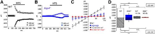 AQP4 regulates the amplitude and kinetics of the swelling-induced TRPV4-mediated transmembrane current. A, B, Representative time course of the HTS (235 mOsm)-evoked whole-cell current in WT (black traces) and Aqp4−/− (blue traces) Müller cells at positive (100 mV; open circles) and negative (−100 mV; filled circles) holding potentials. C, Averaged I-V relationship of HTS-induced currents in WT (white; n = 14) and Aqp4−/− (blue; n = 13) Müller cells, WT cells treated with HC-06 (gray; n = 5), and Aqp4−/− cells treated with HC-06 (red; n = 8). Individual I–V curves of HTS-induced currents were subtracted from pre-HTS baselines. HC-06 was applied 4 min before the application of HTS and was present throughout the experiment. D, Summary for HTS-induced currents at 100 mV (open bars) and −100 mV (shadowed bars) for WT (white) and Aqp4−/− (blue) Müller cells, WT cells treated with HC-06 (gray), and Aqp4−/− cells treated with HC-06.