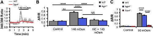 AQP4 amplifies glial HTS-induced TRPV4 activation with moderate (140 mOsm) but not extreme (90 mOsm) HTS. A, B, Ca2+ signals in response to 140 mOsm HTS were blocked in Trpv4−/− (n = 50) and Aqp4−/− (n = 64) Müller cells compared with WT cells (n = 20). HC-06 inhibited HTS-induced [Ca2+]i elevations in WT cells (n = 14) but had no additional effect in Aqp4−/− cells (n = 7), indicating that TRPV4 activation by HTS requires Aqp4. C, At excessively large hypotonic gradients (90 mOsm), Aqp4−/− cells (blue bar) displayed robust HTS-induced [Ca2+]i responses approaching those of the WT cells. Trpv4−/− cells (red bar) showed no [Ca2+]i response when challenged with HTS.