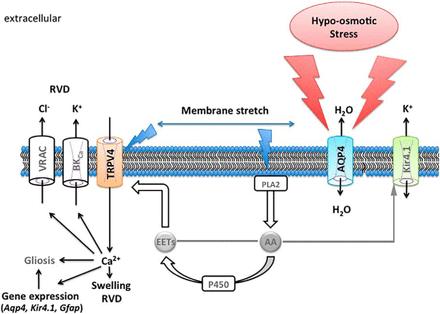 Proposed schema of TRPV4âAQP4 interactions in the Müller cell end foot. Hypotonic stress stimulates fluxes of water after the osmotic gradient. The resulting increase in cell volume stretches the plasma membrane, activating TRPV4 and a Ca2+- and stretch-sensitive PLA2. The product, arachidonic acid (AA), is a precursor for the cytochrome P450-mediated synthesis of eicosanoid metabolites (EETs) that serve as final activators of TRPV4 channels (Ryskamp et al., 2015) but may also suppress Kir4.1 (Bringmann et al., 1998). The expression of Kir4.1 (Reichenbach and Bringmann, 2010) and reactive gliosis (Ryskamp et al., 2014) are modulated by HTS-induced influx of Ca2+. It remains to be determined whether stretch activates PLA2 simultaneously with TRPV4 or whether its activation, which is Ca2+ dependent, amplifies the initial TRPV4 signal (blue arrows). Ca2+ induces both cell swelling (short term) and RVD (long term) and may be required for Ca2+-dependent gene expression (Aqp4, Kir4.1, Trpv4, Gfap). High levels of Ca2+ may also stimulate the activity of BK and VRAC channels and facilitate RVD.