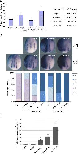 Figure 1. Phosphorylation at SP sites in both the N- and C-terminal regions regulates xNgn2 activity. (A)35S-labelled IVT xNgn2, or the indicated Serine-Proline to Alanine-Proline xNgn2 mutants, full phosphomutant (9S-AxNgn2), N-terminal region (NT-S-AxNgn2) or C-terminal region (CT-S-AxNgn2), were added to Xenopus laevis mitotic egg extracts and incubated at 21°C. Samples were taken at 0, 15, 30, 45, 60, 75, 90 and 120 mins and separated on 15% SDS-PAGE gels. Gels were analyzed by quantitative phosphorimaging analysis, calculating the average stabilization relative to wild-type xNgn2 within mitotic extract. Half-lives were calculated using first-order rate kinetics, and errors calculated using the Standard Error of the Mean (SEM). (B) Embryos were injected into 1 cell of 2 cells with the indicated amount of mRNA encoding GFP, xNgn2, CT-S-AxNgn2 or 9S-AxNgn2, injected side to the left. Embryos were fixed at stage 15 and subjected to in situ hybridization for neural Ã-tubulin expression before being scored for increased neurogenesis on the injected side compared to the uninjected side on a scale of 0¿3 [38]. The experiment was performed in duplicate (n?=?17-37). (C) 1 cell-stage embryos were injected with 20 pg of mRNA encoding GFP, xNgn2, NT-S-AxNgn2, CT-S-AxNgn2 or 9S-AxNgn2, harvested at stage 15 and expression of xNeuroD analysed by qPCR (5 embryos per sample, n?=?3).
