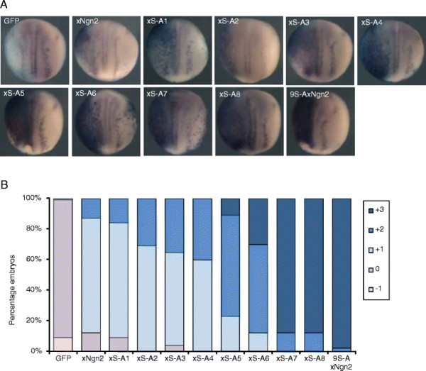 Figure 2. SP site availability semi-quantitatively controls neuronal differentiation activity of xNgn2in vivo. (A) Embryos were injected into 1 cell of 2 cells with 20 pg of mRNA encoding GFP, xNgn2, or the indicated mutant version of xNgn2 from the cumulative mutant series (see Additional file 2: Figure S2), injected side to the left. Embryos were fixed at stage 15 and subject to in situ hybridization for neural Ã-tubulin expression. (B) Scoring of ectopic neurogenesis on the injected side of embryos from (A) on a scale of ?1 - +3 [38]. The experiment was performed in triplicate (n?=?47-87).