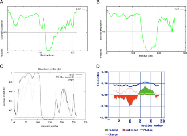 Figure 3. The terminal regions of Ngn2 are predicted to be intrinsically disordered. PONDR-FIT disorder predictions of (A) xNgn2 and (B) mNgn2. (C) DISOPRED2 and (D) FoldIndex disorder predictions of mNgn2.