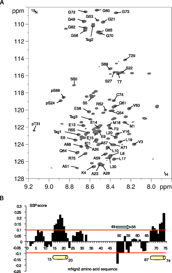 Figure 4. Annotated1H,15N 2D spectra of phosphorylated15N-mNgn2 showing altered structural positions of phosphorylated residues. (A) Detail of overlayed 2D [1H, 15N] HSQC spectra of 15N mNgn2 phosphorylated with cycA/CDK2. Resonances corresponding to phosphorylated Ser and Thr residues are labelled. (B) Secondary Structure Propensity (SSP, [46]) along the mNgn2 sequence calculated based on the available CA and CB chemical shifts (Additional file 4: Table S1). SSP scores correspond to a calculated percentage of occupancy: the 0.1/-0.1 thresholds, here represented as red lines, being empirically proposed for significance. Regions with positive values are associated with a preferential ?-helical conformation, here presented as cylinders. Regions with negative values are associated with a preferential extended conformation, here presented as arrows.