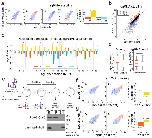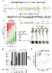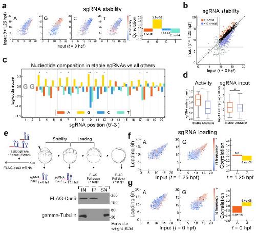 Figure 2. Stable sgRNAs are more active, G-rich and A-depleteda. Biplot of sgRNA levels (log2 RPM) comparing 0 and 1.25 hpf (Experiment shown in Figure 1), colored to indicate the frequencies of the 4 nucleotides in each sgRNA. Corresponding Spearman correlations between nucleotide frequencies and sgRNA stability (ratio of 1.25 hpf to 0 hpf levels) are shown (right), with p values indicated.b. Biplot illustrating stable and unstable groups of sgRNAs, defined by >2-fold enrichment or depletion between 0 and 1.25 hpf (log2 RPM). sgRNAs with low read-counts (bottom 10%) were excluded (grey lines).c. Barplot representing the nucleotide composition of the 20% most stable sgRNAs compared to all others. Bars show log-odds scores of nucleotide frequencies for each position in the sgRNA (1 to 20) (G-test: * <0.05, ** <0.01).d. Box and whisker plots (Box spans first to last quartiles with 1.5x interquartile range distance for whiskers) showing sgRNA activity (left) and the input levels (right) in the stable and unstable sgRNAs. Mann-Whitney U test (**** p< 0.0001, ns: not significant).e. Diagram illustrating the experiment to analyze the Cas9 loading activity in vivo. One-cell stage embryos were injected with 1280 sgRNAs in pools of 80 along with FLAG-cas9 mRNA (see Methods). sgRNA levels were measured at 0 and 1.25 hpf and immunoprecipitation of FLAG-Cas9 was performed at 6 and 9 hpf to analyze levels of loaded sgRNAs. Analysis of the immunoprecipitation of FLAG-Cas9 at 6 hpf (bottom). 1/50 of the total input (IN), the immunoprecipitation (IP) and the supernatant after the immunoprecipitation (SN) were analyzed by western blot using FLAG and gamma-tubulin (as loading control) antibodies.f. Biplot of sgRNA levels (log2 RPM) comparing 1.25 hpf and loaded into Cas9 at 6 hpf, colored to indicate the frequencies of A and G in each sgRNA. Corresponding Spearman correlations between nucleotide frequencies and sgRNA stability (ratio of loaded at 6h to 1.25 hpf levels) are shown (right) with p values indicated.g. Biplot of sgRNA levels comparing 0 hpf and loaded into Cas9 at 6 hpf. (see panel f).