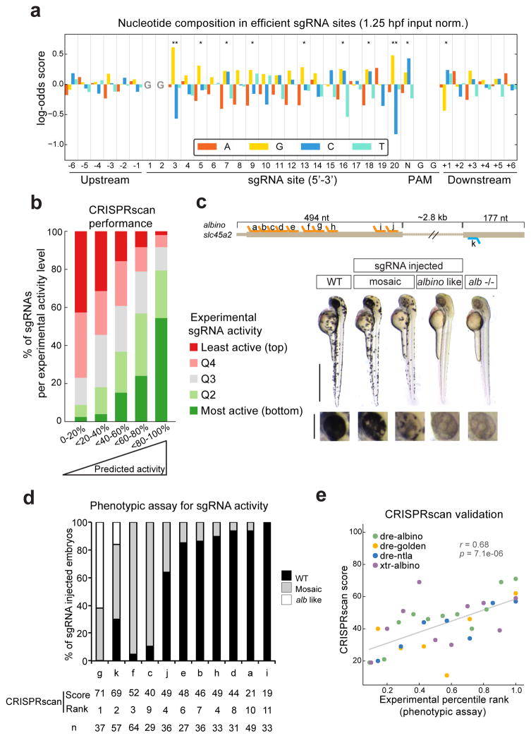 Figure 3. CRISPR/Cas9 activity is modulated by the sgRNA sequencea. Barplot representing the nucleotide composition of the 20% most efficient sgRNA sites (positions 1 to 20 extended by the PAM sequence and 6 nt) compared to all others. Bars show log-odds scores of nucleotide frequencies for each position (G-test: * <0.05, ** <0.01).b. Performance of linear regression based prediction model (CRISPRscan). sgRNAs were divided into quintiles based on CRISPRscan scores (horizontal axis), then each quintile was evaluated based on their experimentally determined activities (colors indicate five activity levels).c. Diagram showing 11 sgRNA sites targeting albino exons 1 and 2 used in an independent validation of the prediction model. Phenotypes obtained after the injection of the sgRNAs, showing different levels of mosaicism compared to the wild type (WT) (bottom). Lateral views and insets of the eyes of 48 hpf embryos are shown. Picture of an albino loss of function mutant (−/−) described in White et al.17 (right). (scale bars: 1mm, 0.25mm inset)d. Phenotypic evaluation of 11 sgRNA targeting albino. Stacked barplots showing the percentage of albino like (white), mosaic (gray) and phenotypically WT (black) embryos 48 hpf after injection. Predicted CRISPRscan scores, ranks and number of embryos evaluated (n) are shown for each sgRNA.e. Scatter plot showing the correlation between CRISPRscan scores and experimentally measured activities based on all phenotypes used to independently validate CRISPRscan (Panel c and d and Supplementary Fig. 4). Spearman correlation and p value are indicated.