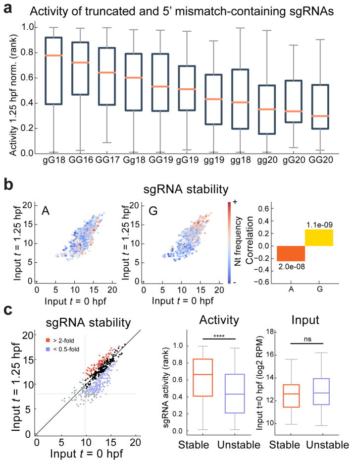 Figure 4. Extending the CRISPR target repertoire with truncated, extended and 5′ mismatch-containing sgRNAsa. Boxplot representing the ranked normalized activity of each class of alternative sgRNAs, ordered by median activity. Shorter sgRNAs (GG16 and GG17) and sgRNAs inducing 1 mismatch in the 5′ GG (gG18 and Gg18) are the most active alternatives to the canonical GG18 sgRNA.b. Biplot of sgRNA levels (log2 RPM) comparing 0 and 1.25 hpf, colored to indicate the frequencies of A and G in each sgRNA. Corresponding Spearman correlations between nucleotide frequencies and sgRNA stability (ratio of 1.25 hpf to 0 hpf levels) are shown (right), with p values indicated.c. Biplot illustrating stable and unstable groups of sgRNAs, defined by >2-fold enrichment or depletion between 0 and 1.25 hpf (log2 RPM) (left). sgRNAs with low read-counts (bottom 10%) were excluded (grey lines). Box and whisker plots showing sgRNA activity (middle) and the input levels (right) in the stable and unstable sgRNAs. Mann-Whitney U test (**** p< 0.0001, ns: not significant).