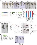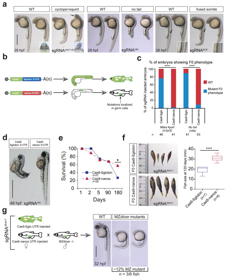 Figure 5. Targeting CRISPR/Cas9 activity to germ cellsa. Wild-type embryos were injected with a combination of 3 sgRNAs (20 pg each) targeting ntla, tbx6 or ndr1/2 and 100 pg of cas9 mRNA (150 in the case of ndr1/2). Pictures were taken at 28 hpf (lateral view). Arrows are indicating cyclopia (ndr1/2) and fused somites (tbx6). (scale bar: 0.5mm)b. Schema illustrating the Cas9-nanos 3′-UTR strategy. Nanos 3′-UTR was cloned after Cas9 ORF. Injection of Cas9-nanos will concentrate the expression in the germ cells (green circles).c. Stacked barplot showing the percentage of coherent F0 phenotype (mutant phenotype) or WT after injection with a combination of 3 sgRNAs (20 pg each) targeting s1pr2 or ntla and using cas9-globin or cas9-nanos mRNA (100 pg). n= number of embryos analyzed. χ2 test (**** p< 0.0001).d. Individual pictures (lateral view) of 48 hpf old embryos injected with the same sgRNA/Cas9 combinations described in panel c (targeting ntla). (scale bar: 1mm)e. Survival curve of Cas9-nanos or Cas9-globin injected fishes. χ2 test (* < 0.05) Embryos were injected with the same sgRNA/Cas9 combinations described in panel c (targeting dicer1).f. Pictures showing fish injected with sgRNA (dicer1) and Cas9-nanos or Cas9-globin 4 months of age. Box and whisker plot showing their size distribution (right). n= number of embryos analyzed. Two-tailed Student’s t test (**** p< 0.0001).g. Scheme illustrating an F0 out cross between sgRNA (dicer1), Cas9-nanos or Cas9-globin injected female fish and dicer1 −/− mutants males generated by germ line transplantation24. Pictures of 32 hpf MZ dicer1 embryos derived from F0 females injected with Cas9-nanos and sgRNA (dicer1) (right). (scale bar: 0.5mm)