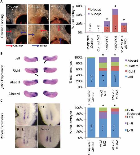 Fig. 1. Nek2 affects LR patterning. (A) Knockdown of nek2 by two different MOs causes heart-looping defects, which co-injection with hNEK2 mRNA rescues. (B) Both overexpression and morpholino knockdown of nek2 lead to abnormal expression patterns of the laterality gene pitx2 in the LPM. Arrows point to asymmetrically expressed pitx2 in the anterior LPM. (C) Both overexpression and morpholino knockdown of nek2 cause perturbation of the normal distribution of dand5 mRNA at the LRO. *Ï2 P-value is <0.01 when compared with controls. â Ï2 P-value is <0.01 when compared with MO1. |
