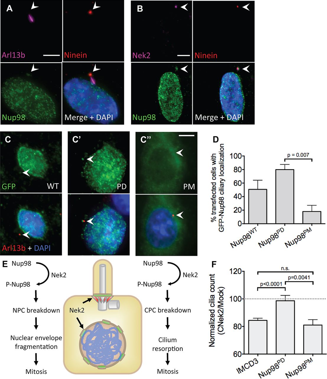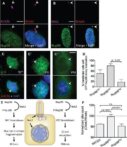 Fig. 6. Nup98 localizes to the base of the cilium and influences Nek2-mediated cilium resorption. (A) RPE1 cells stained with anti-Nup98 antibody show punctate staining across the nuclear envelope and a single focus of staining at the base of the cilium overlapping with the mother centriole marker Ninein. Only the â¼33% of cells that had the cilium positioned distinctly from the nuclear envelope were counted. An average of 42-75% of cells that were scored had Nup98 at the base of the cilium. (B) In interphase cells, Nek2 colocalizes with Nup98 and Ninein. (C) EGFP-tagged Nup98 localizes to the nuclear envelope and to the base of the cilium. (Câ²) PD Nup98 strongly localizes to the nucleus and base of the cilium, whereas (Câ²) PM Nup98 has a more diffuse localization. (D) Percentages of transfected cells with GFP-Nup98 staining at the ciliary base. This experiment was performed three times. (E) Model of hypothesized involvement of Nek2 and Nup98 in cilia resorption. (F) An IMCD3 stable line expressing a Nup98 (PD) construct is significantly more resistant to Nek2-mediated cilium resorption than the parent line or a line stably expressing Nup98 (PM). The normalized cilia count is the ratio between cilia number in transfected cells divided by cilia count in mock-transfected cells. This experiment was performed five times, counting â¼1000 cells each time. Error bars are s.e.m. P-values were calculated by Student's t-test. Scale bars: 10â