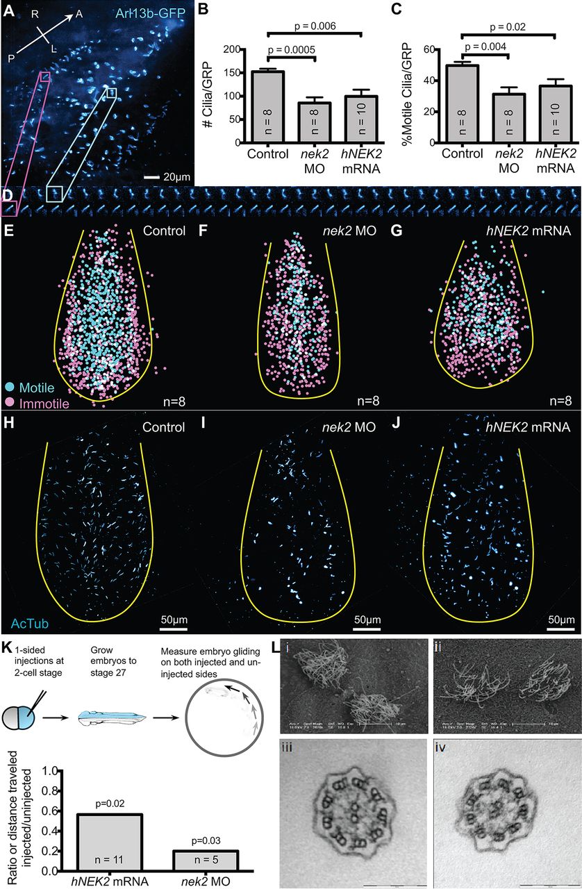 Fig. 2. Both overexpression and knockdown of nek2 lead to loss of cilia numbers and motility at the LRO. (A) z-projection of control LRO during live imaging. A motile cilium is highlighted in cyan; an immotile cilium is highlighted in magenta. (B) There is a reduction of cilia from LROs of nek2 morphants and overexpressors. (C) The percent of motile cilia is significantly reduced in both nek2 morphants and overexpressors. (D) Montage of images of motile and immotile cilia over time from A. (E-G) Maps of the distribution of motile and immotile cilia at the Xenopus LRO. Despite the loss of motile cilia, the distribution of motile cilia is not changed in nek2 morphants and overexpressors. Each map is a composite of the first eight LROs analyzed. (H-J) Acetylated tubulin stainings of LROs showing the loss of cilia in nek2 morphants and overexpressors. (K) Nek2 expression levels affect epidermal cilia. The side of a Xenopus embryo injected with either hNEK2 mRNA or nek2 MO glides significantly less than the control side, suggesting a loss of cilia motility. (L) SEM (i-ii) and TEM (iii-iv) images of epidermal cilia from control (i,iii) and nek2 morphant (ii,iv) embryos. Error bars are s.e.m. P-values were calculated by Student's t-test for B,C. For K, P-values were calculated by paired t-test of distance travelled between the injected and uninjected sides of the embryo. |