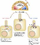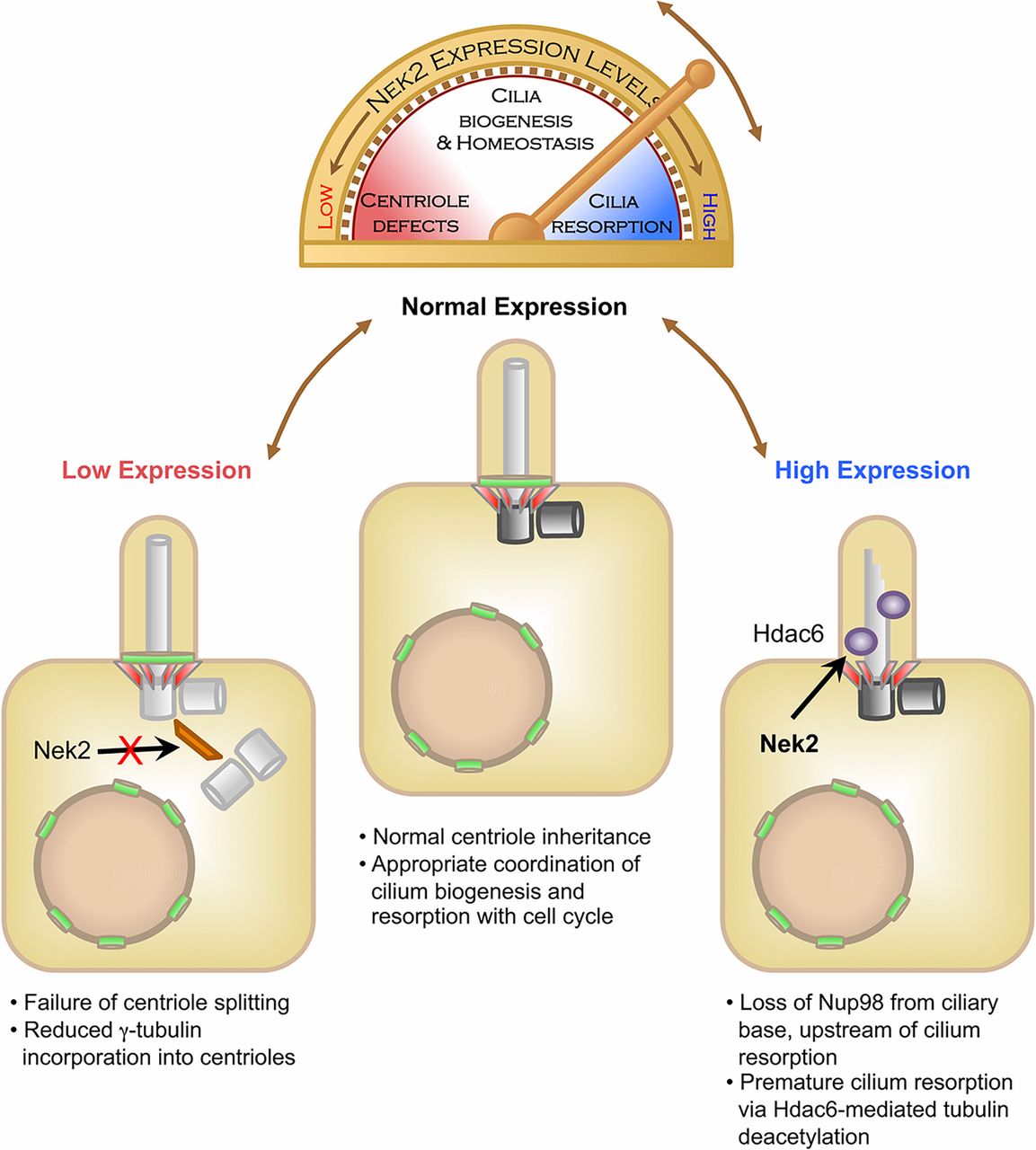 Model of the roles of Nek2 in cilia biogenesis and resorption. Nek2 expression levels are important for cilium homeostasis. Overexpression of Nek2 leads to premature resorption, whereas reduced expression results in a failure of cilium biogenesis. Lower panels are images of cells with low expression, normal expression, and high expression. On the diagrams, nucleoporins are shown in green; centrioles are in gray; Hdac6 is in purple; centriole appendages are in red. |
