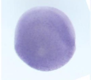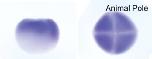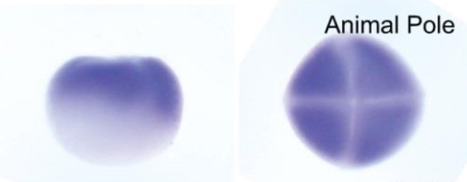 nek2 (NIMA-related kinase 2) gene expression in X. tropicalis embryo, assayed via in situ hybridization, NF stage 3 (4-cell), lateral view (left image) and animal pole view (right image). |