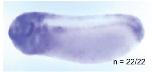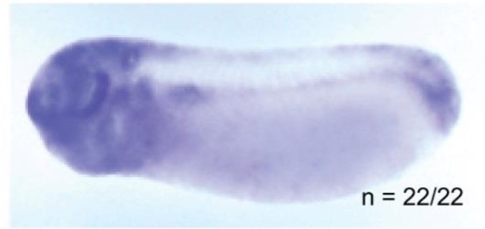 nek2 (NIMA-related kinase 2 ) gene expression in X. tropicalis embryo, assayed via in situ hybridization, NF stage 8.5, lateral view, animal pole up. |