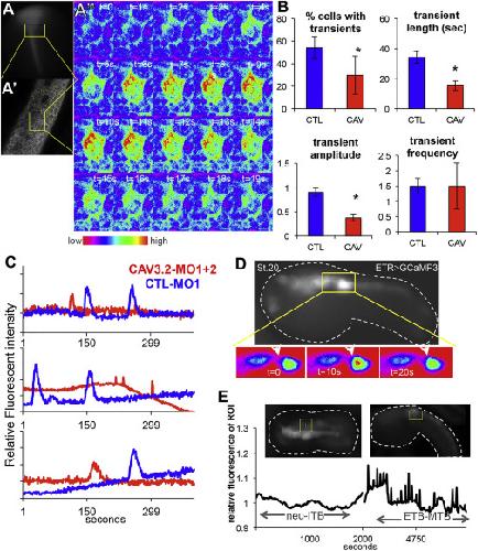 Figure 5. Calcium Transients in the Neural Tubes of C. savignyi and X. laevis (AâAâ²â²) Xenopus embryo injected with GCaMP3 RNA shows Ca2+ transients during neurulation. Top left, a late neurula embryo expressing GCaMP3 in the closing neural tube (A). Low-magnification view of X. laevis embryo shows typical area recorded for Ca2+ transients (yellow box). Anterior is up. (Aâ²) High magnification of the Z plane of the X. laevis anterior neural plate that was imaged. (Aâ²â²) GCaMP fluorescence for a single cell in the neural plate undergoing a Ca2+ transient ([Ca2+] is indicated by color scale). See also Movies S3 and S4. (B) CAV3.2 morpholino knockdown (CAV3.2-MO1, CAV) reduces the number of cells in the neural tube displaying Ca2+ transients and the length and amplitude of the transients, but not the frequency. The y axis in the amplitude graph shows relative fluorescent intensity (see Experimental Procedures). The frequency values are also described in Experimental Procedures. Control embryos were injected with a non-specific MO (CTL-MO2, CTL). Data represent quantification of three embryos from three independent experiments; error bars, SEM (âp < 0.05). (C) Typical Ca2+ transients in CAV-MO knockdown and CTL-MO X. laevis neural tube cells. (D) Ca2+ transients in C. savignyi embryos detected with GCaMP3 expressed from the pan-neural ETR1 promoter. Top panel shows one frame from a time-lapse movie. Lower panel is a close up of the midbrain hindbrain region (yellow box in top panel) showing a single Ca2+ transient with fluorescence intensity using the color scale from (Aâ²â²). See also Movie S5. (E) Time-lapse image of Ca2+ transients in the C. savignyi MHB region. Representative images from two time points (neurula and mid tail-bud) of an embryo expressing GCaMP3 with the MHB region of interest (ROI) are outlined in yellow. Dashed white lines outline the embryo. Bottom panels show relative fluorescence intensity in the ROI over time. Neu-iTB, neurula to initial tail-bud; ETB-MTB, early to mid tail-bud. |