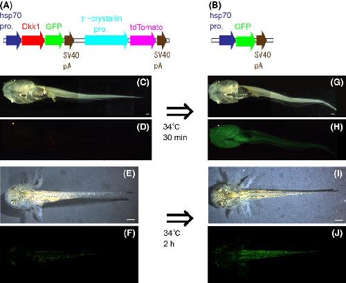 Constructs for transgenesis and transgenic animals used for local gene induction. (A) Map of the heat-shock-inducible Dkk1GFP transgene with lens labeling for Xenopus laevis. Dkk1GFP is located under control of a Xenopus laevis heat-shock promoter (hsp70). (B) Map of the heat-shock-inducible GFP transgene for the newt Pleurodeles waltl. (C) and (D) Prior to heat shock, a X. laevis F1 tadpole at stage 55 containing the transgene could be recognized by the tdTomato fluorescence in its lenses. However no GFP fluorescence could be recognized in the tadpole body. (G) and (H) After whole-body heat shock, ubiquitous Dkk1GFP expression was induced in the tadpole body. This tadpole was photographed at 4 h after heat shock. (E) and (F) Prior to heat shock, a P. waltl F2 two-week-old larva had no obvious GFP fluorescence but had a few background spots around the eye and tail. (I) and (J) After whole-body heat shock, ubiquitous GFP expression was induced in the body. This larva was photographed 72 h after heat shock. Scale bar = 1 mm.