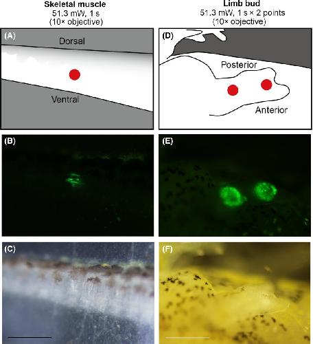 Infrared laser irradiation (IR-LEGO) operation in Pleurodeles waltl. The upper panels (A, D) show the irradiated areas marked by red circles. The middle panels (B, E) are fluorescent images and the lower panels (C, F) are bright field images. (A) Skeletal muscles in a larval newt (2 weeks old) were irradiated. (B, C) Pictures were taken 16 h after irradiation. (D) A left forelimb bud (7 days post-amputation) of a larva (7 weeks old) was irradiated from the dorsal side. (E, F) Pictures were taken 16 h after irradiation. Scale bar = 500 μm.