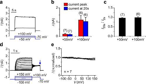 Figure 3. TPC3 channels do not inactivate(a) Representative whole-cell currents activated by 20-s-long step pulses to +50 and +100 mV (Vh = −70 mV). (b) Average amplitudes of the current peak and those at the end of pulses (20 s). (c) Current amplitudes obtained at the end of pulses normalized to those at the beginning (2 s). (d) Steady-state inactivation of TPC3. Currents were recorded with a test pulse to +100 mV following a pre-pulse of 2 s in duration, at voltages ranging from −100 to +150 mV (10-mV step). (e) Current amplitudes at the end of the test pulses (arrow in d) were plotted against pre-pulse voltages. Whole-cell currents were recorded from HEK293T cells transfected with drTPC3 (non-tagged). GFP-tagged drTPC3 generated similar non-inactivating currents (not shown; see also Fig. 2). Numbers of cells are indicated in parentheses. Data are represented as mean ± s.e.m.