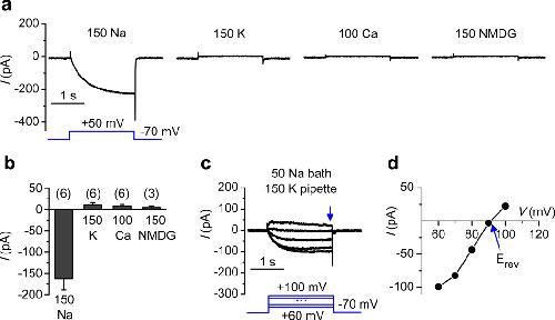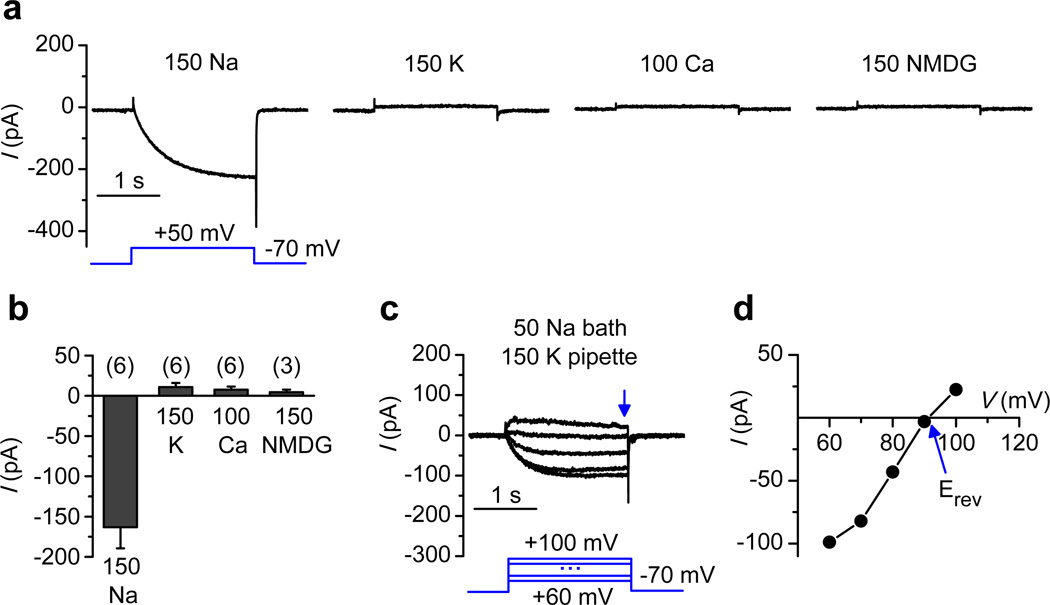 Figure 4. TPC3 channels are Na+- selectiveWhole-cell currents were recorded from GFP-drTPC3-transfected HEK293T cells. Representative traces (a) and average amplitudes (b) of currents recorded with a pipette solution containing 150 mM NMDG+ and bath containing 150 mM Na+, 150 mM K+, 100 mM Ca2+, or 150 mM NMDG+ as indicated. (c) Representative currents elicited by voltage pulses (illustrated) under bi-ionic condition (150 mM K+ in pipette and 50 mM Na+ in bath). (d) Current sizes obtained from c plotted against test pulse voltages to obtain reversal potential (Erev) for the calculation of relative permeability. Data are represented as mean ± s.e.m.