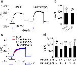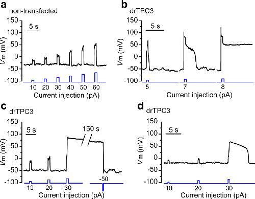 Figure 7. TPC3 supports ultra-long action potentials and membrane bistabilityRepresentative whole-cell current clamp recordings were performed in HEK293T cells without (a) or with (b–d) GFP-drTPC3 transfection. Depolarizing current injection stimuli (illustrated below each recording with the sizes indicated) were applied. ulAPs were elicited from resting membrane potentials of −50 mV in b and c, or −20 mV in d.