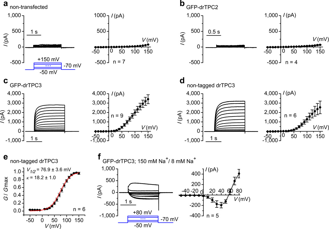 Figure 2. TPC3 forms a high voltage-activated plasma membrane Na+ channel(a–d) Whole-cell currents recorded with symmetrical [Na+] (150 mM) in the bath and pipette from nontransfected HEK293T cells (a), or cells transfected with GFP-tagged drTPC2 (GFP-drTPC2) (b), GFP-drTPC3 (c) or non-tagged drTPC3 (d). (e) Normalized conductance (G/Gmax) – voltage (V) relationships reconstructed from d. (f) Similar to panel c but recorded under asymmetrical [Na+] conditions (150 mM in the bath and 8 mM in the pipette). Left panels show representative traces obtained with a step voltage protocol (shown in a for a–d, and in f). Current (I)-voltage (V) relationships constructed using the current sizes at the end of the voltage steps are in right panels. Data are represented as mean ± s.e.m.