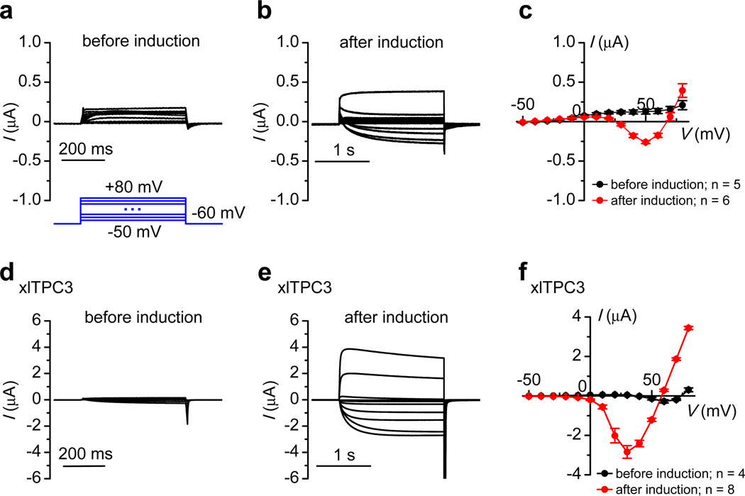 Figure 8. TPC3-like current in Xenopus oocytesTwo-electrode voltage-clamp recordings were performed with Xenopus oocytes without (a–c) or with (d–f) xlTPC3 RNA injection. (a, b, d, e) Representative currents recorded with a voltage step protocol (−50 to +80 mV with a 10-mV step, Vh = −60 mV, shown in a) before (a, d) and after (b, e) the oocyte was “induced” with a 60-s depolarization of +50 mV. Capacitive transient currents are masked for clarity. (c, f) Average current-voltage relationships. Data are represented as mean ± s.e.m.