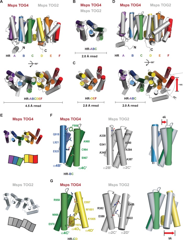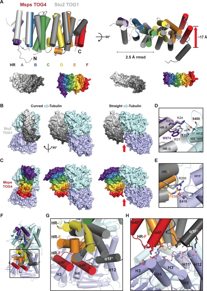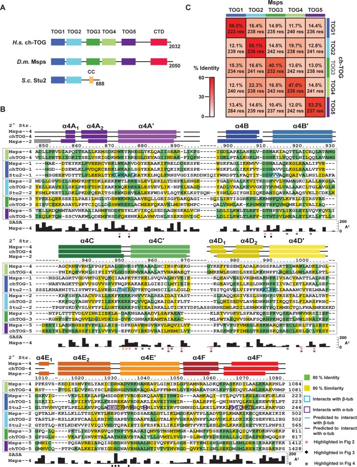 XMAP215 family members are potent microtubule (MT) polymerases, with mutants displaying reduced MT growth rates and aberrant spindle morphologies. XMAP215 proteins contain arrayed tumor overexpressed gene (TOG) domains that bind tubulin. Whether these TOG domains are architecturally equivalent is unknown. Here we present crystal structures of TOG4 from Drosophila Msps and human ch-TOG. These TOG4 structures architecturally depart from the structures of TOG domains 1 and 2, revealing a conserved domain bend that predicts a novel engagement with α-tubulin. In vitro assays show differential tubulin-binding affinities across the TOG array, as well as differential effects on MT polymerization. We used Drosophila S2 cells depleted of endogenous Msps to assess the importance of individual TOG domains. Whereas a TOG1-4 array largely rescues MT polymerization rates, mutating tubulin-binding determinants in any single TOG domain dramatically reduces rescue activity. Our work highlights the structurally diverse yet positionally conserved TOG array that drives MT polymerization.
