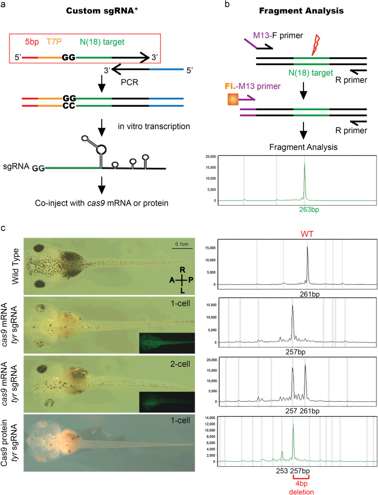 Fig. 1. Strategy for custom sgRNA design, Fragment Analysis, and study of tyrosinase CRISPR phenotype and genotype. (a) Strategy for custom sgRNA design (PCR method) with the red box outlining the forward primer for any target gene of interest. *This strategy was modified from that described by Nakayama et al. by addition of 5 bp anchor sequence and use of Ambionâs MegaShortscript kit, which greatly increases RNA yield (See Methods). The forward primer consists of 5 bp anchor sequence (red), T7 promoter (yellow), 18 bp target sequence (green), and 20 bp complimentary overhang with reverse primer (black). The stock reverse primer consists of 20 bp complementary overhang (black) and the remaining sgRNA sequence (blue). With one PCR step we generate the full sgRNA template. We then use in vitro transcription to generate the sgRNA which is co-injected with cas9 mRNA or protein. (b) Strategy for fragment analysis. Forward primer with a 5â²-m13 overhang sequence is used with a R-primer to PCR amplify the target locus. A 2nd PCR step with a florescent m13 Primer and the same R-primer are used to generate a fluorescently tagged PCR amplicon, which is run on a capillary electrophoresis gel and analyzed. (c) Stage 42 embryos and their FA genotype (dorsal view, anterior to the left). FA genotype â X-axis size of amplicon in basepairs (bp), Y-axis relative intensity of PCR signal to loading control. WT tadpole and the corresponding 261 bp PCR amplicon; Tadpole injected at 1-cell stage with cas9 mRNA+tyr sgRNA and corresponding 257 bp FA peak (4 bp deletion). GFP co-expression is observed in whole embryo; Tadpole injected at 1-of-2-cell stage with cas9 mRNA+tyr sgRNA on left side (GFP co-expression only on left) and both deletion and WT peaks detected with FA; Tadpole injected with Cas9 protein and tyr sgRNA at 1-cell stage with 257 bp deletion peak on FA.