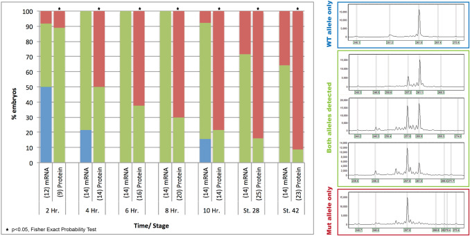 Fig. 2. Time course of CRISPR/Cas9 deletions. All embryos injected with tyr sgRNA and either injected with cas9 mRNA or Cas9 protein. X-axis=time/ stage of embryos post-injection (number of embryos in parenthesis). Y-axis=% embryos with corresponding FA genotype (blue=WT allele only, green=both alleles detected, red=mutant allele only). Statistical analysis performed by Fisher exact probability test, *=p<0.05.