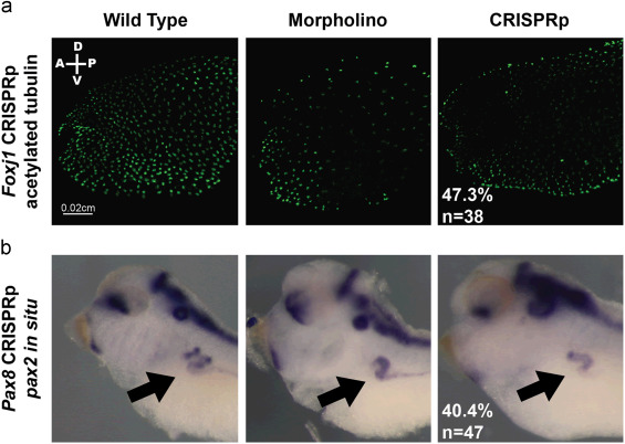 Fig. 3. CRISPR injected embryos phenocopy established mutant or MO knockdown phenotypes in the F0 generation. Left panel=WT embryo, Middle panel=MO injected embryo, Right panel=CRISPRp injected embryo. (a) Foxj1 CRISPRp â Immunohistochemistry of stage 28 embryos with acetylated tubulin to mark surface cilia. (b) Pax8 CRISPRp â in situ hybridization of stage 38 embryos with pax2 probe to stain kidney tubule. Black arrow points to pronephros.