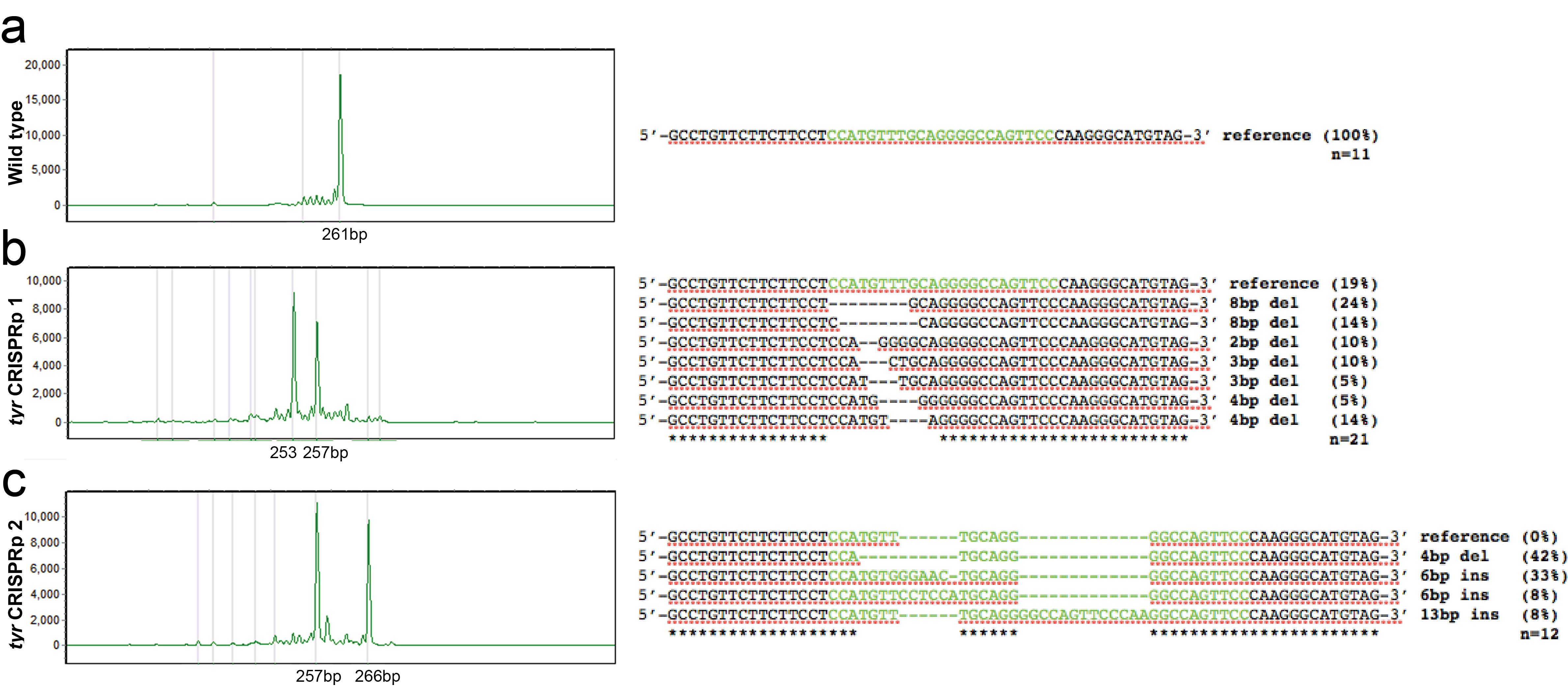 Supplemental Fig. 1. Topo-cloned sequence of deletion and insertion peaks. Green marks the target sequence,-marks deletions or insertions, * marks identical sequence to WT. FA genotype â X-axis=size of amplicon in basepairs (bp), Y-axis=relative intensity of PCR signal to loading control. (a) WT FA peak at 261 bp and corresponding sequence from n=11 clones. (b) Embryo injected with Cas9 protein+tyr sgRNA. FA shows two main peaks at 253 bp and 257 bp, corresponding to 8 bp and 4 bp deletions and their corresponding sequences from n=21 clones. (c) Embryo injected with Cas9 protein+tyr sgRNA. FA shows two main peaks at 257 bp and 266 bp, corresponding to 4 bp deletion and 5 bp insertion and their corresponding sequences from n=12 clones.