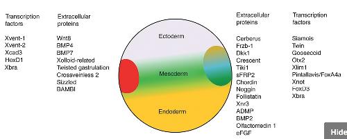 Fig 2. Dorsoventral (DV) and anteroposterior (AP) patterning by inductive and antagonistic signals emanated by the Spemann organizer and the ventral gastrula center (red). At the early to middle gastrula stage, both the Spemann organizer and the ventral gastrula center express a panel of extracellular proteins and transcription factors. They functionally interact and form a complex regulatory network to pattern the embryonic axes. The list of genes shown here is certainly not complete. The Spemann organizer is shown by different colors to represent its heterogeneity.