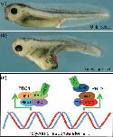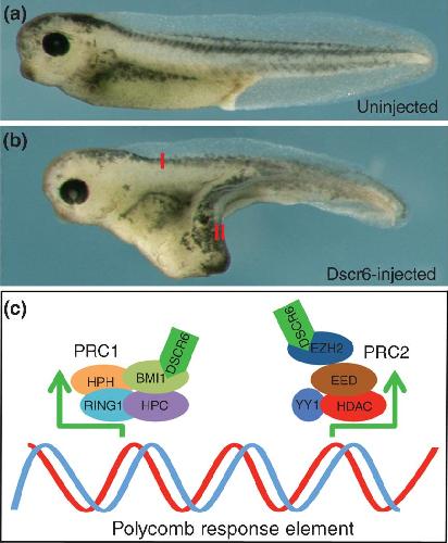 Figure 6. Transcriptional derepression and embryonic axis formation. (a) A normal larval stage Xenopus embryo. (b) Formation of a secondary axis without anterior structures following DSCR6 overexpression in the ventral region (I and II refer to the primary and the induced axis, respectively). (c) Proposed model of DSCR6 function in transcriptional derepression. DSCR6 interacts directly with components within the polycomb repressive complex (PRC) 1 and 2. In the absence of DSCR6, the complexes bind chromatin and repress the transcription of mesoderm genes. The interaction between DSCR6 and BMI1 and EZH2 removes PRC1 and PRC2 from chromatin and contributes to transcriptional derepression.