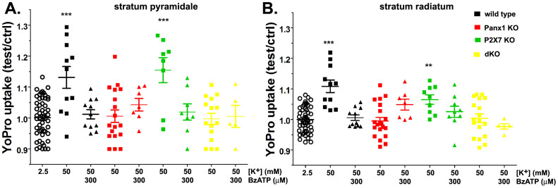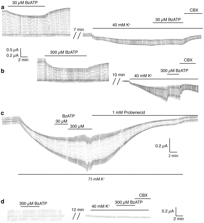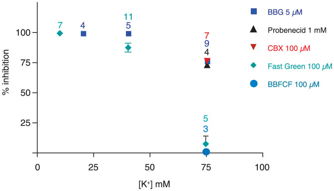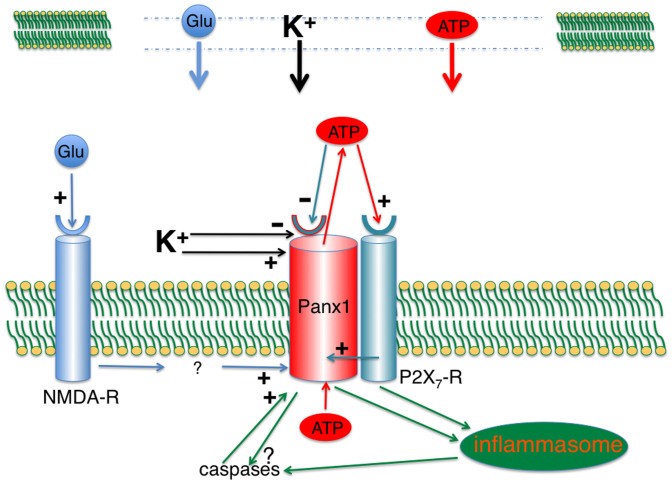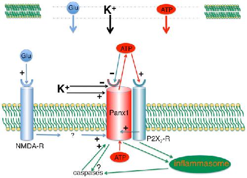 The ATP release channel Pannexin1 (Panx1) is self-regulated, i.e. the permeant ATP inhibits the channel from the extracellular space. The affinity of the ATP binding site is lower than that of the purinergic P2X7 receptor allowing a transient activation of Panx1 by ATP through P2X7R. Here we show that the inhibition of Panx1 by ATP is abrogated by increased extracellular potassium ion concentration ([K(+)]o) in a dose-dependent manner. Since increased [K(+)]o is also a stimulus for Panx1 channels, it can be expected that a combination of ATP and increased [K(+)]o would be deadly for cells. Indeed, astrocytes did not survive exposure to these combined stimuli. The death mechanism, although involving P2X7R, does not appear to strictly follow a pyroptotic pathway. Instead, caspase-3 was activated, a process inhibited by Panx1 inhibitors. These data suggest that Panx1 plays an early role in the cell death signaling pathway involving ATP and K(+) ions. Additionally, Panx1 may play a second role once cells are committed to apoptosis, since Panx1 is also a substrate of caspase-3.