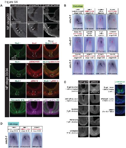 BMP and FGF, but not RA or Wnt/β-catenin, signals during stage NF13-20 are necessary for induction of thyroid nkx2-1 in Xenopus. Xenopus embryos were either: 1) injected with mRNA encoding dominant negative BMP receptors (dnBMPR) or dominant negative FGF receptors (dnFGFR), or 2) cultured in the indicated pathway antagonists from stage NF13 to NF20. In-situ hybridization analysis for nkx2-1 expression at stage NF35 was used as marker of thyroid specification. The number of embryos for each condition with the displayed phenotype is indicated. (C) Immunostaining of pAKT, pERK and pSmad1/5/8, confirmed the efficacy of BMP and FGF pathway inhibition in the indicated conditions. (D) In-situ hybridization analysis for nkx2-1 expression at stage NF35 of Xenopus embryos cultured in the indicated pathway antagonists from stage NF20 to NF35. The number of embryos for each condition with the displayed phenotype is indicated.