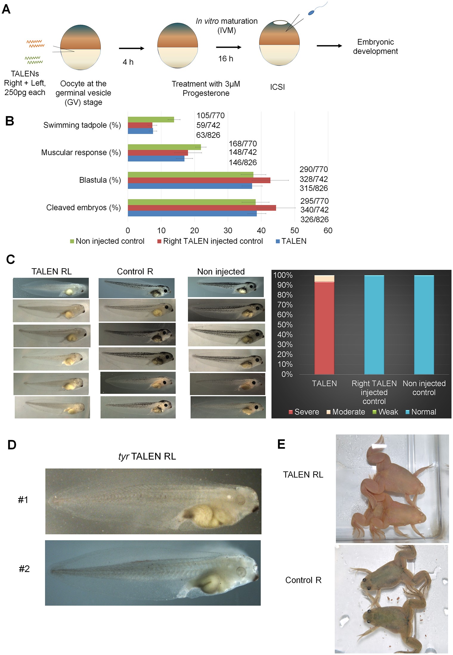 (A) Schematic diagram of the experiment to express TALENs in Xenopus laevis eggs before fertilization. (B) Development of tyrosinase (tyr) TALENs-expressed oocytes. TALEN mRNA-injected GV oocytes, followed by in vitro maturation and ICSI, were able to develop to the swimming tadpole stage although mRNA injection itself seems to decrease the developmental capacity of in vitro matured eggs. Actual numbers of embryos that were injected with sperm and that developed to each developmental stages are indicated next to the corresponding bars. (C-E) Expression of tyr TALENs in GV oocytes allowed almost complete albino phenotypes in F0 embryos and frogs. Enlarged pictures of two TALEN-RL-expressed tadpoles are shown in Fig 1D. Control R represents control embryos and frogs in which only right side TALEN was expressed.