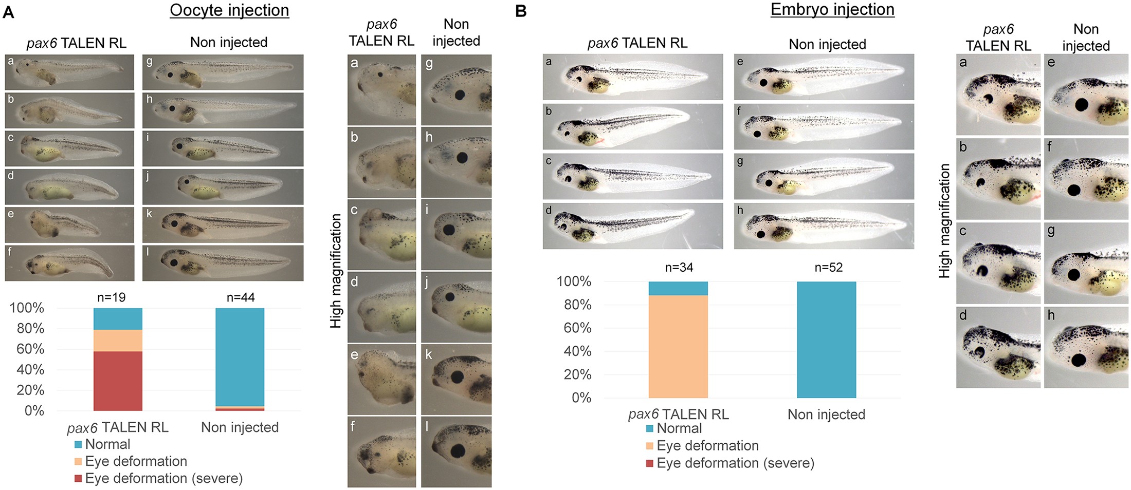 (A) Injection of pax6 TALEN mRNAs to GV oocytes, followed by in vitro maturation and ICSI, recapitulated the null mutant phenotype of pax6 in F0 embryos. Examples of knock-out tadpoles with different magnifications (a-f; pax6 TALEN-expressed tadpoles, g-l; control tadpoles) are shown. The percentages of embryos that showed the knock-out phenotype of pax6 are summarized in the graph, as judged by the degree of eye deformation. Embryos without TALEN mRNA injection are used as a control (Non injected). (B) Different phenotypes are observed at the tadpole stage between conventional embryo injection (Fig 2B) and the oocyte injection method (Fig 2A). TALEN mRNAs were injected into fertilized one-cell stage embryos. Examples of pax6 TALEN-expressed tadpoles with different magnifications (a-d; pax6 TALEN-expressed tadpoles, e-h; control tadpoles) are shown.