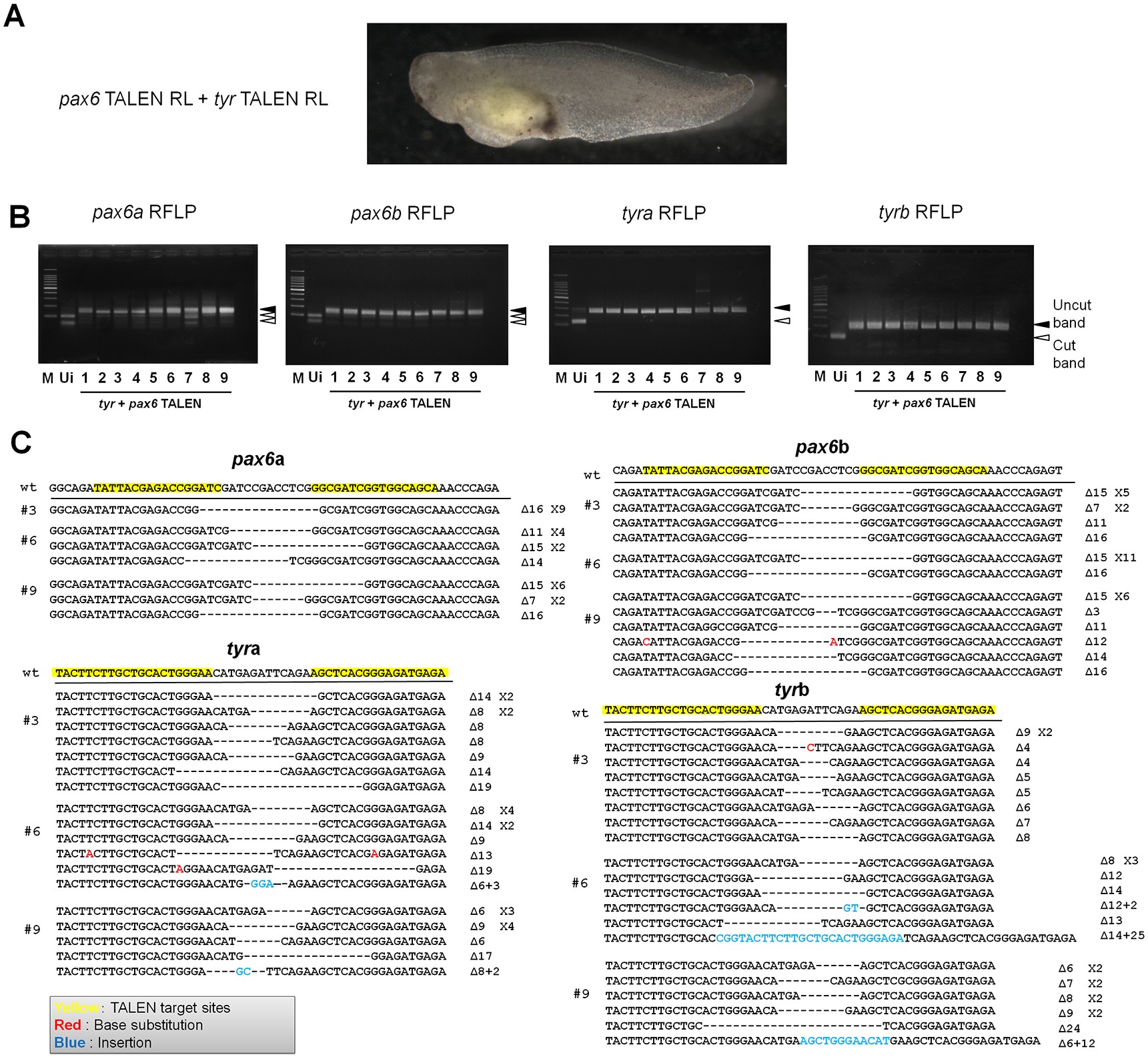 (A) Double knock-out of pax6 and tyr was achieved by TALEN mRNA injection to GV oocytes. A double knock-out tadpole is shown. (B) Detection of pax6 and tyr mutants by RFLP analysis. Wild type embryos are cut by restriction enzymes (Ui: uninjected embryo), while mutant embryos are not digested. Digested PCR products appear at lower bands (marked by open arrowheads) and the undigested is marked by closed arrowheads. M represents 100 bp ladder marker. (C) Sequencing of three different embryos (#3, #6, #9; the numbers correspond to those in Fig 3B) revealed the 100% mutation rate in pax6 and tyr double knock-out embryos.
