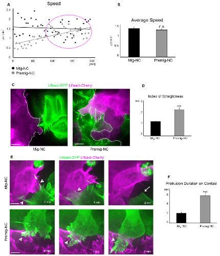 Supplemental Figure S1. Related to Figure 1. (A, B) Diagram of speed over time for Mig- NC and Premig-NC. Time 0 corresponds at the time which the NC are plated in vitro. Premig-NC start to migrate slowly, but soon they migrate at the same speed that Mig-NC. In the rest of this work collisions were analysed during timepoints 120-240 (circled in magenta), when the average speed of Mig-NC and Premig-NC was similar. (B) Average speed (Mig-NC n=28 cells, Premig-NC n=39 cells; n.s. not significant). (C) Time lapse stills of an explant overlap assay, outline indicates the boundary between the explants. Scale bar 10 μm. (D) Index of straightness for Mig-NC and Premig-NC (Mig-NC n= 9 explants Premig-NC n=8 3 explants), *** p<0.001). (E) Time lapse stills of an explant overlap assay, arrowheads: protrusions; arrow: protrusion collapsing. Scale bar 5 μm. (F) Protrusion duration upon contact for Mig-NC and Premig-NC (Mig-NC n= 32, Premig-NC n=23 protrusions) *** p<0.001. All box and whiskers charts: box: median±25th/75th percentile, whiskers: min/max value, bar charts: mean ± s.e.m. |
