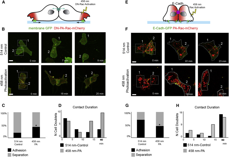 Figure 6. Inducing Protrusion Repolarization by Rac1 Photoactivation Is Sufficient to Trigger CIL and Junction Disassembly(A) DN-PA-Rac1 was photoactivated at the protrusions of Mig-NC cells.(B) Stills of Mig-NC doublets expressing DN-PA-Rac-Cherry. Illumination is shown in boxed areas with 514 nm control wavelength (top) or with 458 nm wavelength (bottom). Scale bar represents 10 μm.(C) Percentages of adhesion and separation upon Photoactivation in DN-PA-Rac-Cherry Mig-NC (514, n = 15, 458, n = 21).(D) Histogram of contact duration upon photoactivation in DN-PA-Rac-Cherry expressing Mig-NC.(E) PA-Rac1 was photoactivated at the edge of Premig-NC cells.(F) Stills of E-Cadh-GFP/PA-Rac-Cherry expressing Mig-NC doublets. Illumination is shown of boxed areas with 514 nm control wavelength (top) or with 458 nm wavelength (bottom). Scale bar represents 10 μm.(G) Percentages of adhesion and separation upon Photoactivation in E-Cadh-GFP/PA-Rac-Cherry Mig-NC (514 nm, n = 24, 458 nm, n = 31 cells), âα = 5%.(H) Histogram of contact duration in E-Cadh-GFP/PA-Rac-Cherry Mig-NC upon photoactivation. All box and whiskers charts are as follows: box and median are ± 25th/75th percentile. Whiskers are min/max value, and bar charts are mean ± SEM. |