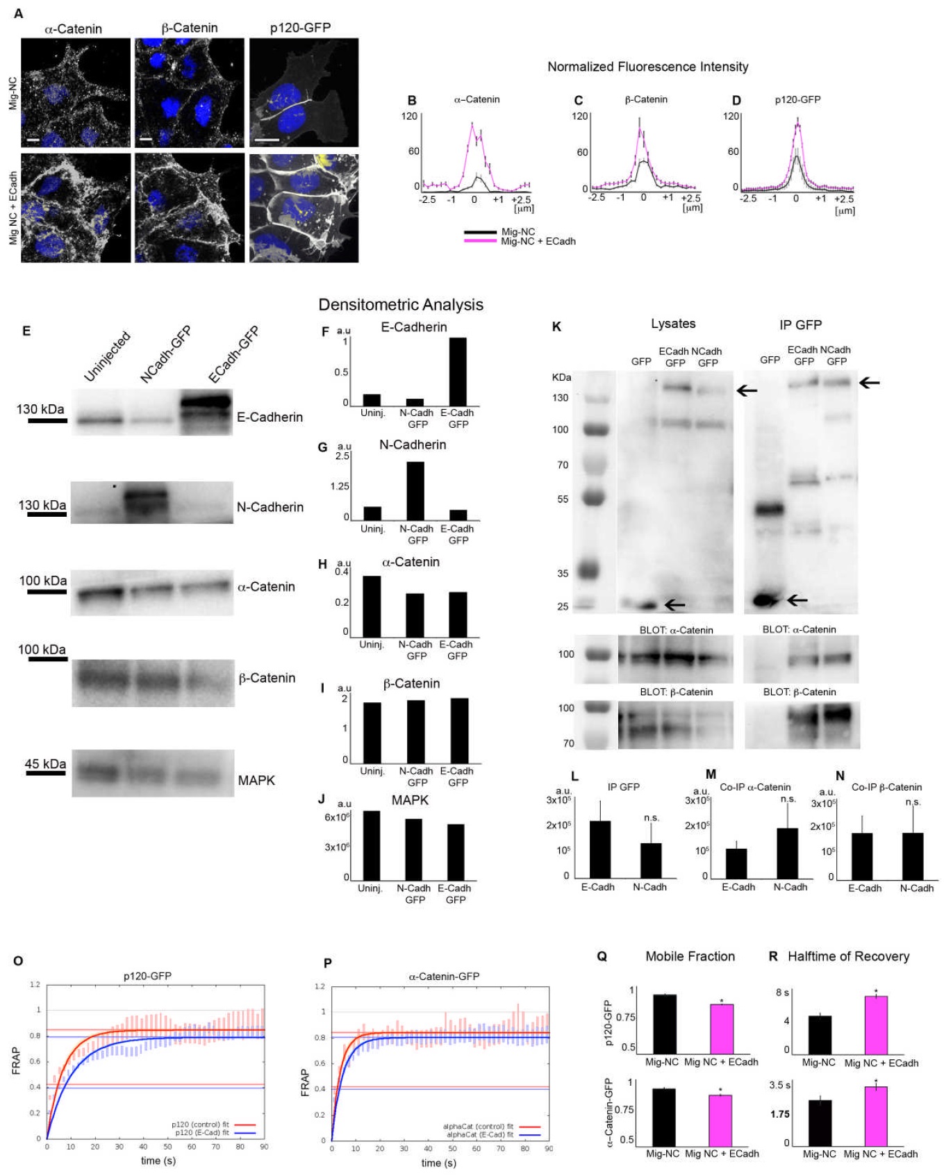 Supplemental Figure S4. Related to Figure 3. (A) Immunostaining for α-catenin and β- catenin, fluorescence image for p120-GFP in Mig-NC and Premig-NC, scale bars 10 μm, nuclear staining: DAPI. (B,C, D) Fluorescence intensity across cell-cell junctions normalised to fluorescence in adjacent cell cytoplasm (α-catenin: Mig-NC n=50; Mig-NC+E-Cadh n=50, 2 independent experiments, β-catenin: Mig-NC n=50; Mig-NC+E-Cadh n=50; p120-GFP: Mig-NC n=30; Mig-NC+E-Cadh n=30,3 independent experiments). (E) Western blot (WB) of stage 19 embryo lysates. Antibody blotting as illustrated. (F-J) Densitometric analysis of the WB shown in (E), with (F-I) representing ratio between the antibody band intensity and the pixel intensity for MAPK (J). (K) Immunoprecipitation (IP) of GFP, E-cadh-GFP, N-Cadh-GFP from Stage 19 embryo lysates. A WB of lysates is shown in left panel. Pull down of GFP is 7 shown in right panel. Coimmunoprecipitation of α- and β-Catenin and their corresponding lysates is shown in the bottom panels. (L-N) Pixel volumetric intensity of GFP IP (L) and corresponding co-immunoprecipitates for α-catenin (M) and β-Catenin (N) (n=5 independent experiments, error bars: s.e.m, n.s. not significant. (O, P). FRAP single exponential fits for recovery curves for p120-GFP (O) and ï¡-Catenin-GFP (P), vertical bars: s.d of FRAP data. Shades around fitting curves: 95% confidence intervals (c.i). (Q, R) Fitting FRAP parameters for p120-GFP (top) and α-catenin-GFP (bottom) in Mig-NC and Mig-NC+E-Cadh. Mobile fraction in (Q), Halftime of recovery in (R) (n=18 FRAP regions for Mig-NC, n=24 FRAP regions for Mig-NC+ECadherin for p120-GFP; n=29 FRAP regions for Mig-NC, n=36 FRAP regions for Mig-NC+ECadherin for α-catenin-GFP FRAP, 3 independent experiments, error bars: 95% c.i., *P<0.05). Bar charts: mean±s.e.m. |