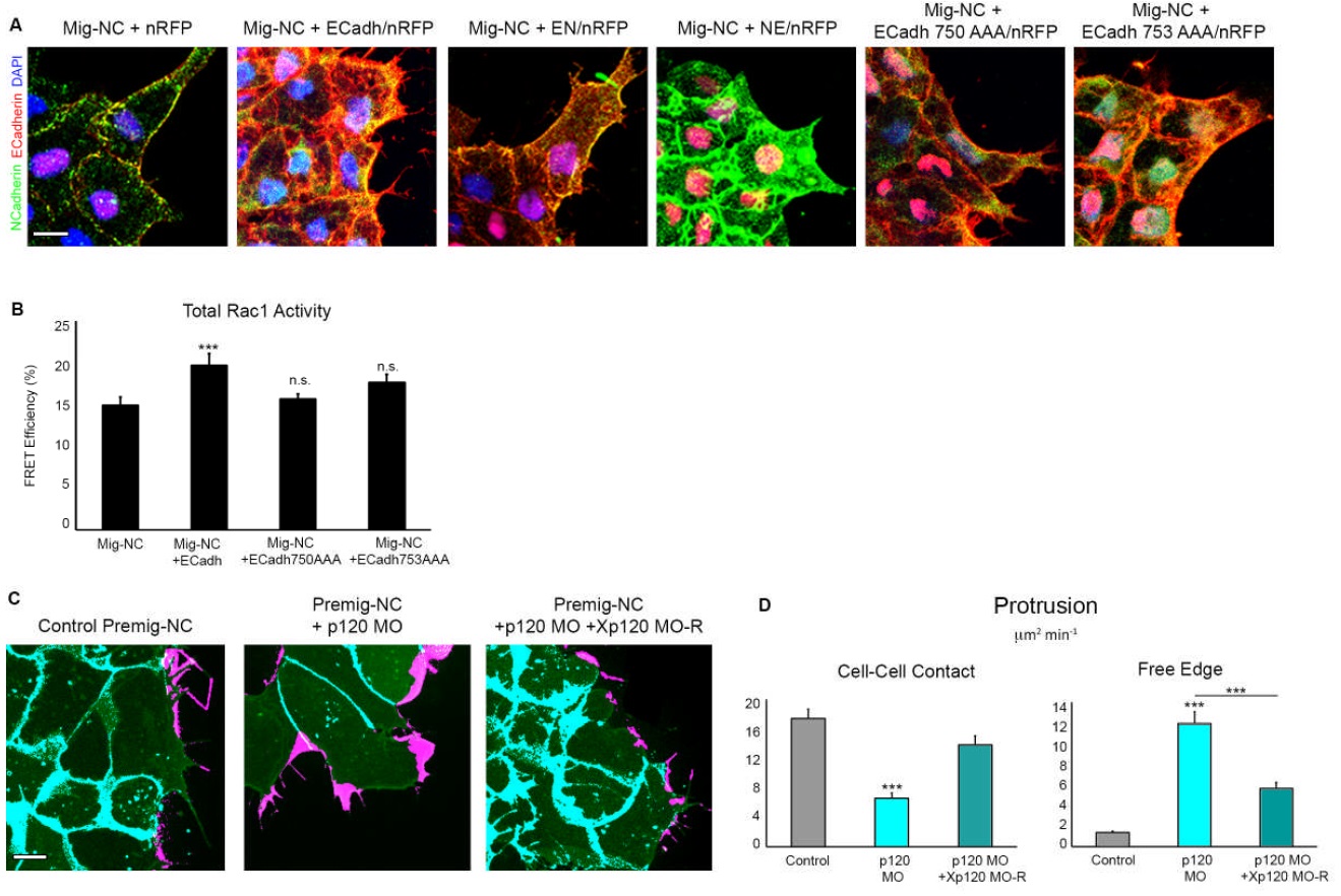 Supplemental Figure S5. Related to Figure 4. (A) Double immunostaining for E- and NCadherin in Mig-NC, Mig-NC+E-Cadh, Mig-NC+E/N, Mig-NC+N/E, Mig-NC+E-Cadh750AAA, Mig-NC+E-Cadh753AAA, scale bar 10 μm. Both antibodies are specific for the EC domain of each cadherin, therefore distinguishing the expression of the swapped CYTO domains mutants. (B) Rac1 FRET efficiency measured by acceptor photobleaching for Mig-NC, Mig- NC+E-Cadh and the p120-uncoupled mutants E-Cadh750AAA and E-Cadh753AAA (n=16 Mig-NC, n=22 Mig-NC+E-Cadh, n=15 Mig-NC+E-Cadh750AAA, n=12 Mig-NC+ECadh753AAA * P<0.05, *** P<0.001. (C) Protrusive activity of Premig-NC+ Control MO, Premig-NC+p120 MO or Premig-NC+p120 MO+Xp120 mRNA. Still time-lapse photographs of a maximal projection, Free Edge protrusions labelled in magenta, Cell-Cell contact protrusions labelled in cyan (Right), scale bar 10 μm. (D) Quantitation of Protrusion area per minute per cell obtained by subtraction analysis (n= 104 cells Premig-NC+Control MO, n=95 cells Premig-NC+p120 MO, n=103 Premig-NC+p120 MO+Xp120 mRNA*** P<0.001. Charts: mean ± s.e.m. |