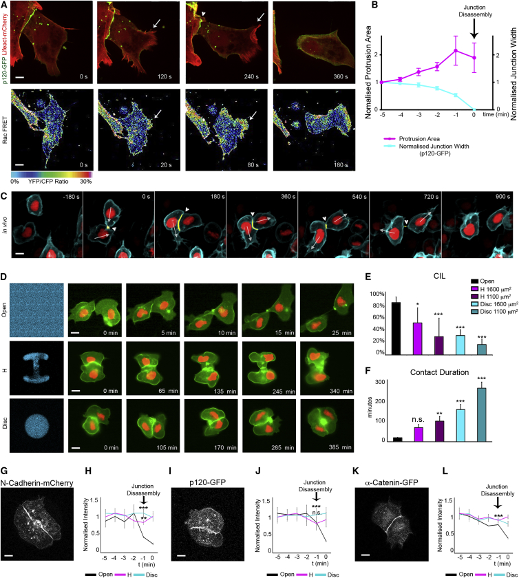 Figure 5. Repolarization Is Required to Promote Junction Disassembly(A) Time lapse stills of junction disassembly in a Mig-NC cell-cell collision. (Top) cells expressing p120-GFP and Lifeact-Cherry. Scale bar represents 5 μm. (Bottom) heatmap stills of Raichu-Rac1 FRET. Scale bar represents 7.5 μm.(B) Protrusion area and junction width over time. Junction disassembly occurs at t = 0. Cell-cell junctions were identified by p120-GFP (n = 11 cell-cell collisions), Spearman correlation coefficient r = −0.943, ∗p = 0.017.(C) Time lapse stills of cell-cell contact disassembly in colliding NC cells in vivo in Sox10:H2BmCherry/GFP-GPI zebrafish embryos. Arrows, direction of movement; arrowheads, cell-cell contact. Scale bar represents 10 μm.(D) Time lapse photographs of confined cells. Mig-NC labeled with membrane GFP and nuclearRFP (nRFP) cultured on uniform or H-shaped or disc-shaped micropatterns of fibronectin (Fn-650). Scale bar represents 10 μm.(E) Percentage of CIL (freely migrating [FM], n = 139, H, 1,600 μm2, n = 61, H, 1,100 μm2, n = 35, disc 1,600 μm2, n = 34, disc 1,100 μm2, n = 22), ∗α = 5%, ∗∗∗α = 0.1%.(F) Duration of cell-cell contact, ∗∗p < 0.01, ∗∗∗p < 0.001.(G, I, and K) Time-lapse stills of Mig-NC confined on a disc micropattern expressing N-cadherin-cherry (G), p120-GFP (I), α-catenin-GFP (K). Scale bar represents 5 μm.(H, J, and L) Fluorescence intensity over time for N-Cadherin-Cherry (H), p120-GFP (J), α-catenin-GFP (L). N-cadherin-cherry FM, n = 7, H, n = 4, disc, n = 6; p120-GFP FM, n = 7, H, n = 4, disc, n = 8; α-catenin-GFP FM, n = 9, H, n = 4, disc, n = 4, ∗∗p < 0.01. All box and whiskers charts are as follows: box and median are ± 25th/75th percentile. Whiskers are min/max value, and bar charts are mean ± SEM. |