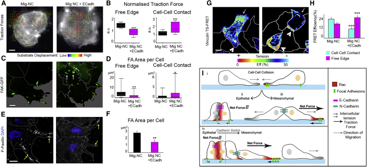 Figure 7. E-Cadherin Impairs CIL by Perturbing the Distribution of Forces in Mig-NC(A) Traction force microscopy superimposed to membrane RFP. Arrows show the magnitude and direction of bead displacement. Scale bar represents 20 μm.(B) Normalized TF at free edge (left) and cell-contacts (right) (Mig-NC, n = 9, Mig-NC+E-Cadh, n = 7), âââp < 0.001.(C) Stills of Mig-NC and Mig-NC+E-Cadh explants expressing FAK-GFP. Cell borders are outlined, and scale bar represents 5 μm. Note that E-cadherin leads to the formation of FA at the cell-cell contact (arrows).(D) FA area per cell at free edge (left) and cell-contacts (right) (Mig-NC, n = 32, Mig-NC+E-Cadh, n = 56 cells), âp < 0.05, ââp < 0.01.(E) P-paxillin immunostaining in Mig-NC and Mig-NC+ECadh. Arrows show FA at the free edge. Cell borders are outlined, and scale bar represents 10 μm. Nuclear staining is DAPI.(F) FA area per cell (Mig-NC, n = 10, Mig-NC+E-Cadh, n = 10 explants), ââp < 0.01.(G) Spatial distribution of tension in Mig-NC and Mig-NC+E-Cadh clusters measured by Vinculin-TS FRET. In Mig-NC, tension is high at leading edge (arrow) and inhibited at cell-cell contact (arrowheads); in Mig-NC+E-Cadh, tension distribution is opposite. Cell borders are outlined, and scale bar represents 5 μm.(H) Vinculin-TS FRET efficiency at cell-cell contact and leading edge (n = 24 cells, Mig-NC, n = 24 cells, Mig-NC+E-Cadh), âââp < 0.001. All box and whiskers charts show the following: box and median are ± 25th/75th percentile. Whiskers are min/max value, and bar charts are mean ± SEM.(I) Model of CIL. (i) Cell collision is shown. Two possible outcomes exist, depending if cells are epithelial (ii) or mesenchymal (iii). (ii) Epithelial cells stabilize their junctions after collision. At the cell contact, Rac is activated, FAs are formed, and traction forces are generated. As there is no polarity on traction forces, the net forces is zero. (iii) Mesenchymal cells dissemble their junctions during CIL. At the cell contact, Rac is inhibited, FAs are disassembled, and traction forces are polarized at the free edge. (iv) E- to N-cadherin switch during EMT leads to CIL response. |