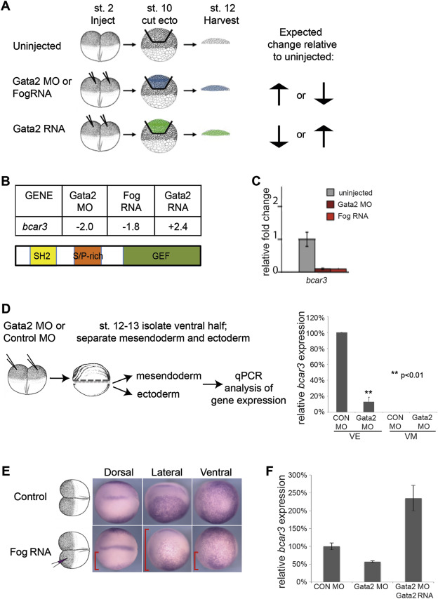 Identification of bcar3 as a target of Gata2 in ectoderm during gastrulation. (A) Schematic of strategy for microarray analysis and target gene identification. Gata2 MO (40 ng), Fog RNA (500 pg) or Gata2 RNA (500 pg) was injected into both cells of two-cell embryos and ectoderm was explanted when embryos reached stage 10. When sibling embryos reached stage 12, RNA was isolated from ectoderm for microarray analysis. Genes showing upregulation in Gata2 MO and Fog RNA injected embryos, and downregulation in Gata2 RNA injected embryos were identified as putative negative targets of Gata2. Genes showing downregulation in Gata2 MO and Fog RNA injected embryos, and upregulation in Gata2 RNA injected embryos were identified as putative positive targets of Gata2. (B) Table showing fold change in bcar3 expression relative to uninjected controls detected by microarray analysis and schematic diagram of Bcar3 structure, SH2: Src homology 2 domain, S/P-rich: Serine/Proline-rich domain, GEF: Guanine nucleotide exchange factor like domain. (C) qPCR analysis of bcar3 gene expression in ectodermal explants isolated at stage 10 from embryos that had been injected with Gata2 MO or Fog RNA and cultured to stage 12. The level of expression of bcar3 was normalized to that in ectoderm from uninjected controls. (D) Gata2 MO (40 ng) or control MO (40 ng) were injected into both cells of two-cell embryos and ventral ectoderm and ventral mesendoderm were dissected at stage 12â13. RNA was extracted from tissue from 10 pooled explants in three independent experiments and bcar3 gene expression was analyzed by qPCR. The level of expression of bcar3 was normalized to that in ectoderm from control MO injected embryos. VE: ventral ectoderm, VM: ventral mesendoderm, ND: not detected. (E) Fog RNA (500 pg) was injected into one cell of two-cell embryos and expression of bcar3 was examined at stage 15 using WMISH. Uninjected embryos were used as controls. In each row, dorsal, lateral and ventral views of the same embryo are shown. Brackets indicate the Fog RNA injected side. (F) Gata2 MO (40 ng), control MO (40 ng), or Gata2 MO (40 ng) and Gata2 RNA (1 ng) together was injected into both cells of two-cell embryos and ectoderm was explanted when embryos reached stage 10. When sibling embryos reached stage 12, RNA was isolated from ectoderm for qPCR analysis. The level of expression of bcar3 was normalized to that in ectoderm from control MO injected embryos. |