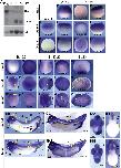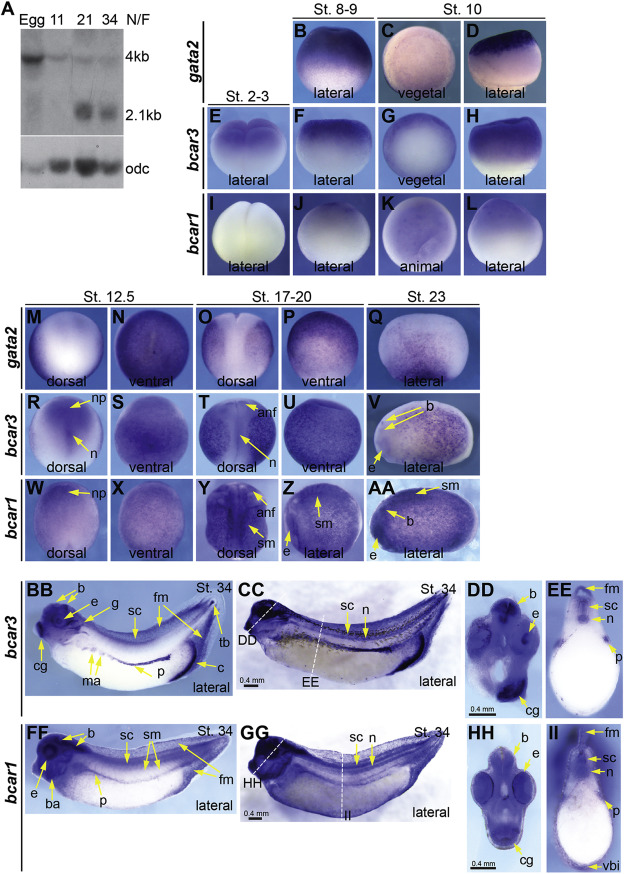 Expression patterns of gata2, bcar3 and bcar1 during Xenopus development (A) Northern analysis showing bcar3 RNA transcripts. odc was used as a loading control. All lanes are from the same blot, aligned following removal of intervening lanes (following the 2nd and 3rd lanes) using Photoshop. N/F: Nieuwkoop and Faber stages. (B-II) WMISH analysis of expression of gata2 (BâD and MâQ), bcar3 (EâH, RâV and BBâEE) and bcar1 (IâL, WâAA and FFâII) during development. For each stage, the same embryo is shown in animal, vegetal, lateral, dorsal or ventral views. The embryos in panels CC and GG were mounted in Murray's clear to visualize internal structures. Brown is pigment. All other embryos were photographed in PBS to visualize superficial structures. (DD, EE, HH and II) Transverse sections of previously stained st. 34 embryo at the level shown in panels CC and GG respectively. Np: neural plate, n: notochord, anf: anterior neural folds, b: brain, sm: somitic mesoderm, e: eye, cg: cement gland, g: cranial ganglia, sc: spinal cord, fm: fin mesenchyme, tb: tail bud, ma: abdominal muscle anlagen, p: pronephros, c: cloaca, ba: branchial arches, vbi: ventral blood island. |